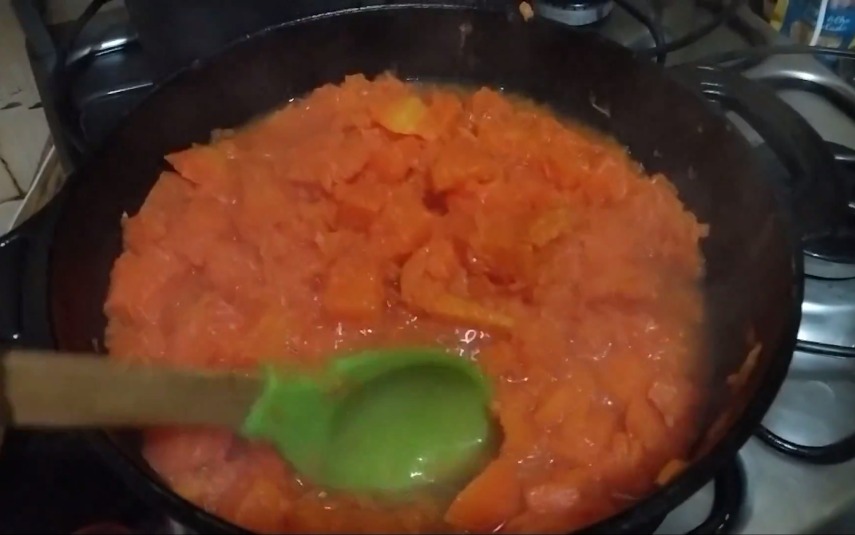 A abóbora vai soltar muita água, então ela vai cozinhando e desmanchando, quando estiver bem desfiada (pode ajudar espremendo com a colher) adicione o açúcar e o tempero e deixe apurar (secar um pouco mais o doce).