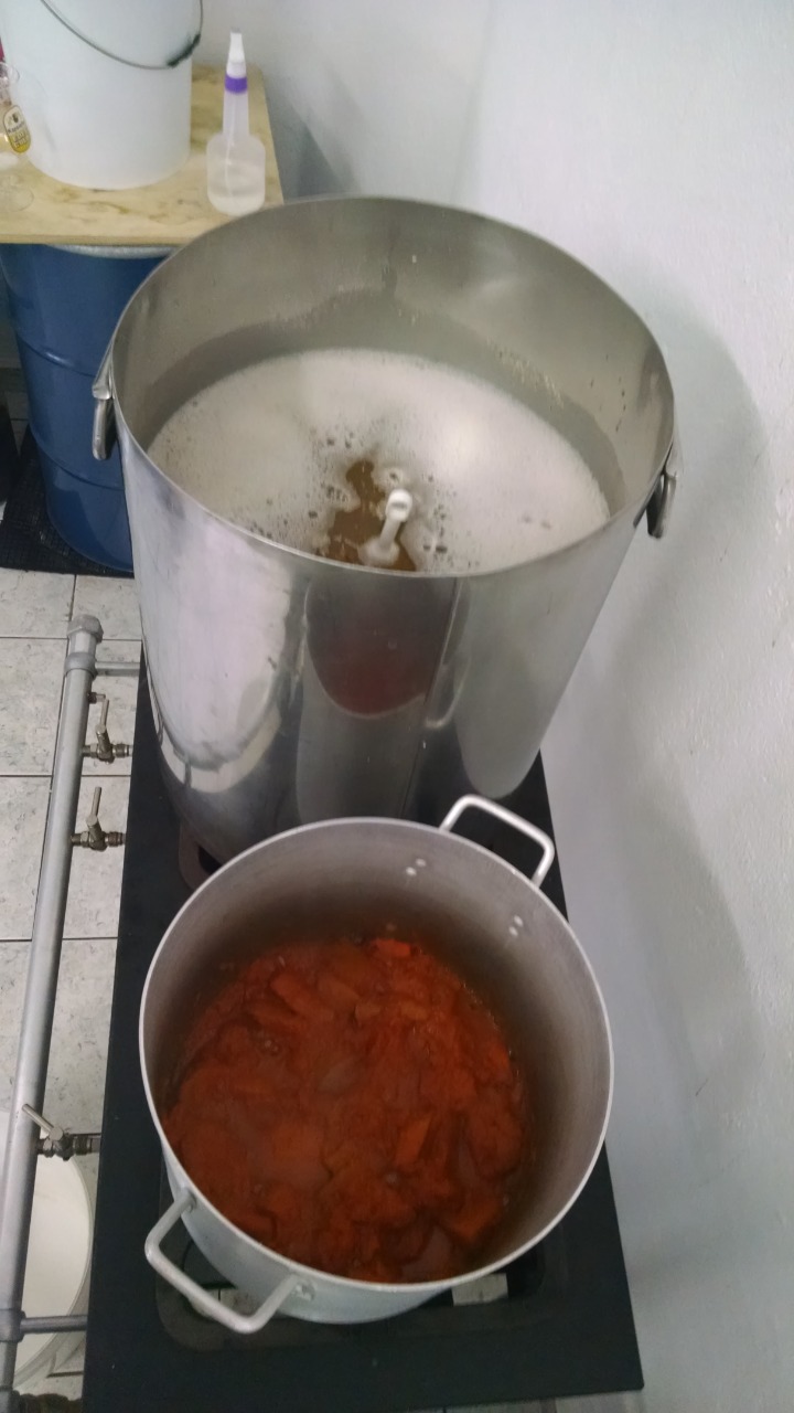 O Doce de Abóbora eu adiciono no meio da fervura em um grain bag mexendo de tempo em tempo para ajudar a extrair todo gosto do doce. Sempre cálculo 1Kg de doce para cada 20L e o doce eu faço em casa mesmo, a receita do doce é bem simples: